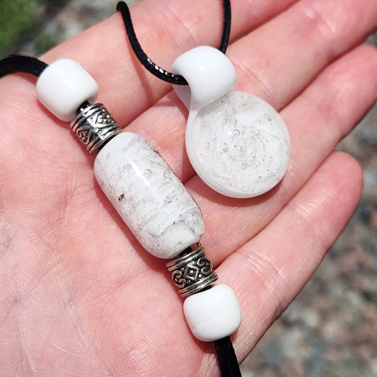 At our studio, we specialize in crafting custom glass keepsakes using a wide variety of ashes, including human and pet cremains or fire ashes. Our stainless steel jewelry can also have fur, hair, and other special items. When you place your order with us, we'll provide you with a comprehensive collection kit complete with easy-to-follow instructions. Since glass has a magnifying effect, we only require a small amount of ashes - between ¼ and ½ a teaspoon per keepsake - to create a stunning and unique piece of jewelry. Our collection kit includes everything you need to safely and easily send us the ashes, and the cost of shipping the kit is included in the price of your order. Let us help you create a one-of-a-kind memorial that you'll treasure forever.